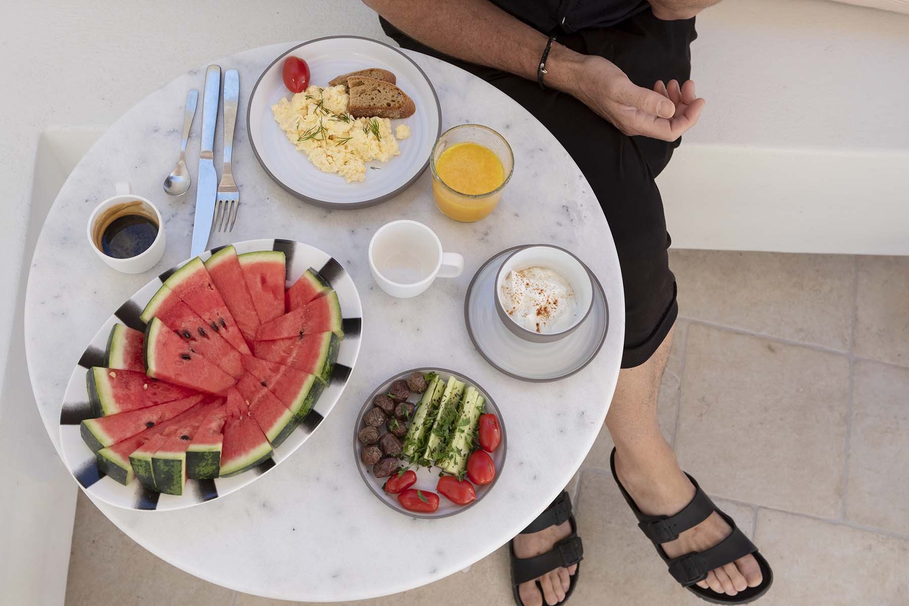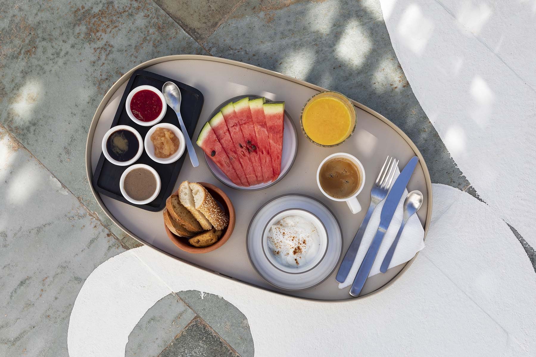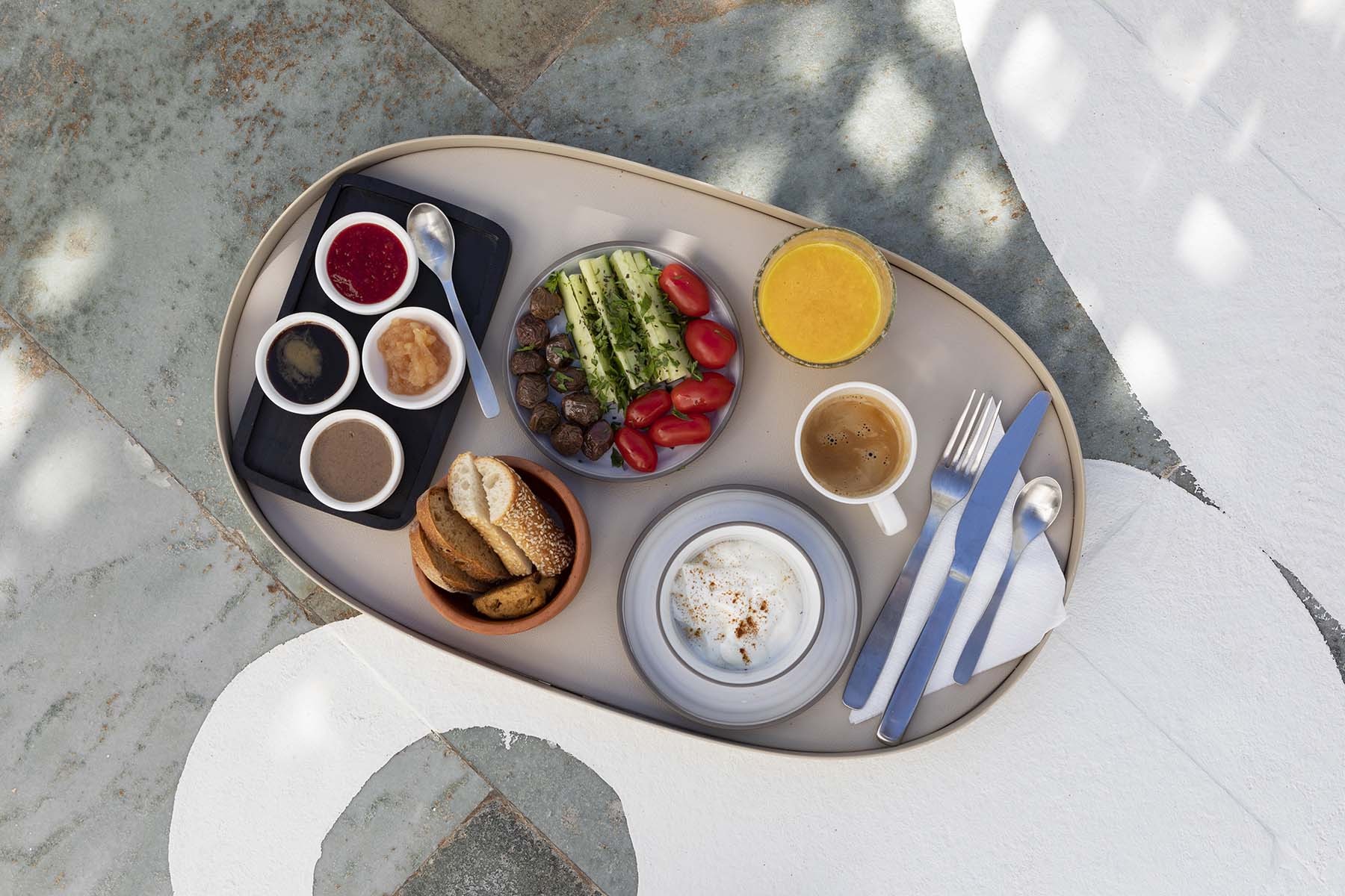 Un petit-déjeuner gourmand, healthy et avec des options vegan, créé en collaboration avec le chef Esco du restaurant The Plant Kingdom à Athènes, est servi tous les matins en extérieur tandis que de délicieuses spécialités grecques préparées avec les produits saisonniers du marché y sont concoctées tout le reste de la journée.
